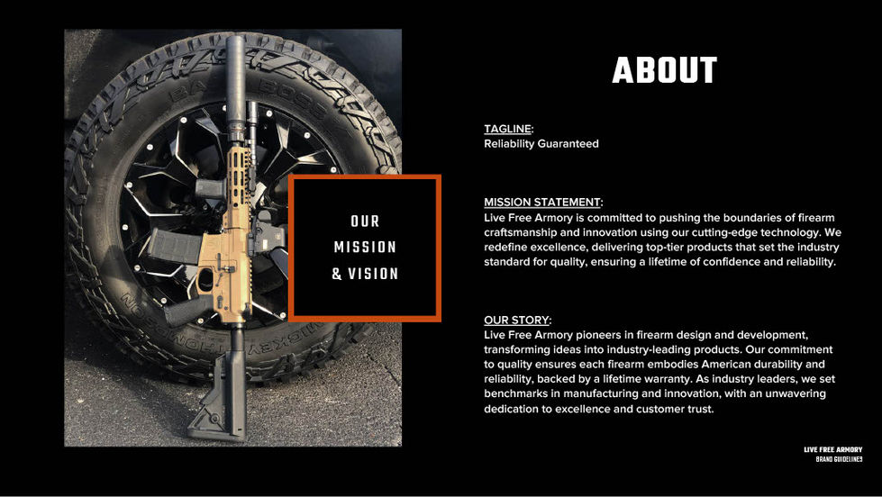 This project showcases the brand guidelines, design elements, and visual identity of Live Free Armory. It includes the main and supporting logos, typography guidelines, color palette, and usage guidelines.